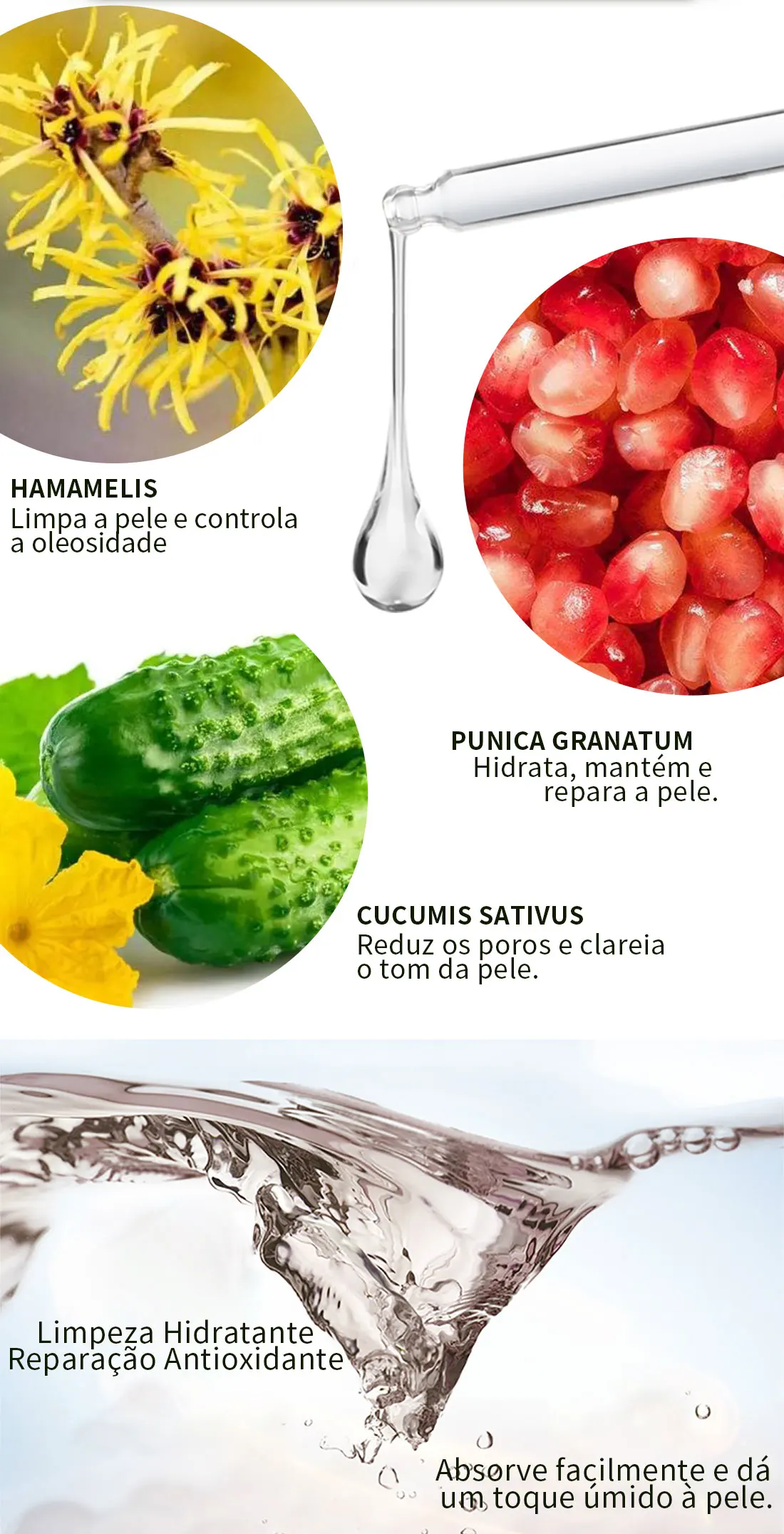 Aqua, propilenoglicol, água hamamelis virginiana (avelã), hidroxiacetophenona, hidroxietilcelulose, fenoxietanol, glicirrhizato de dipotássio, extrato de fruta pepino sativus (pepino), extrato de granato de punica, fosfato dissódico, polissorbato, 60, fenolsulfonato de zinco, fosfato de sódio, óleo de rícino hidrogenado peg-40, metilparabeno, etilhexilglicerina, ci 16255, aroma